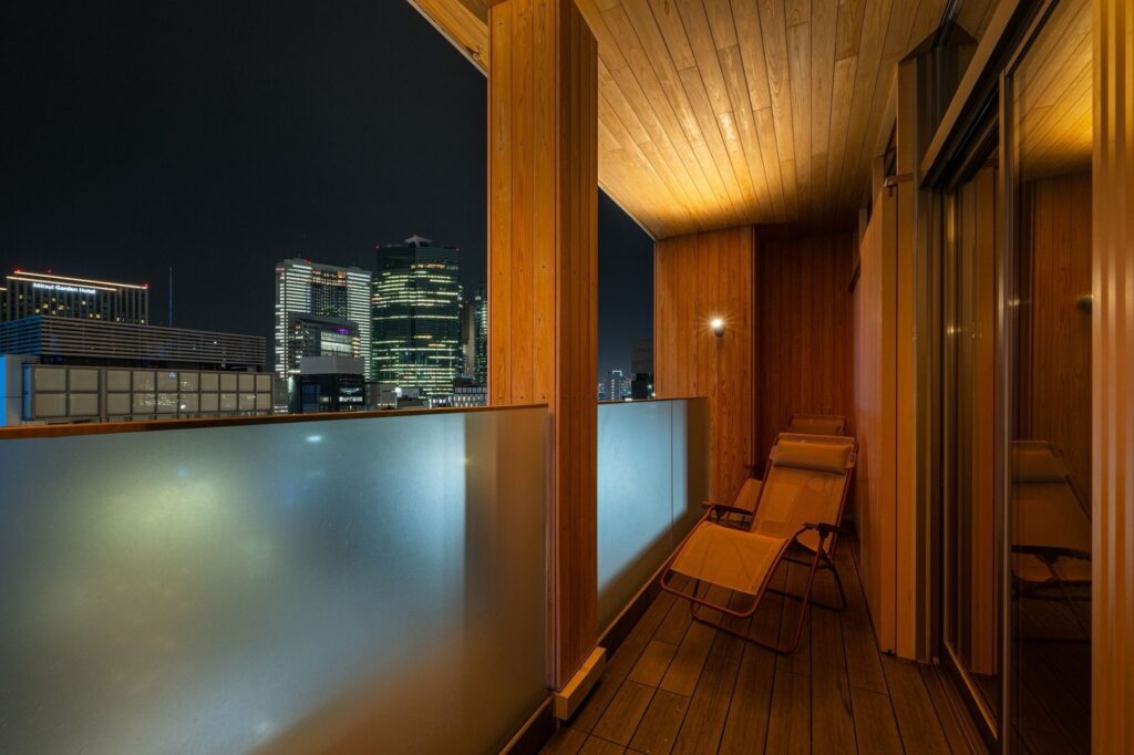 モダンな木造サウナと、都会の夜景を望む休憩スペース。