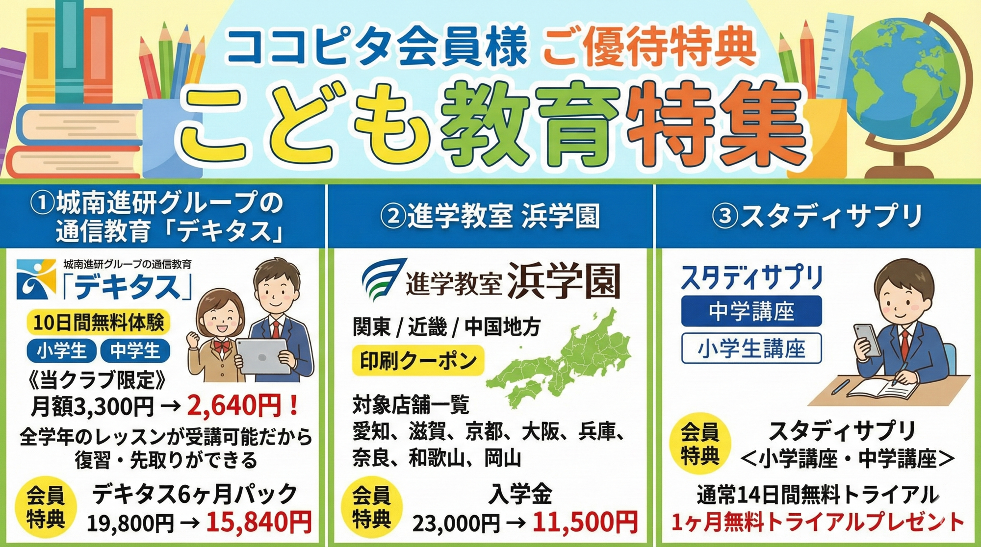 ココピタ会員様なら、人気の通信教育や進学塾を会員特別価格で利用できます。