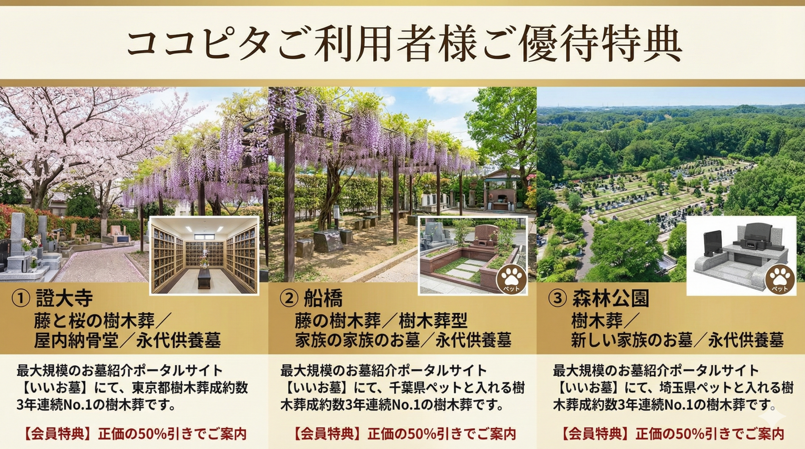 今回、ココピタ会員様限定で**「正規価格の50%引き」**となる対象施設は、日本最大級のお墓紹介ポータルサイト「いいお墓」にて、成約数3年連続No.1を獲得している超人気施設ばかりです。
